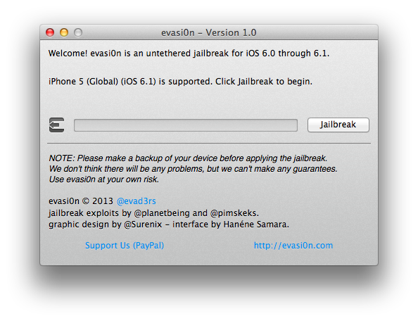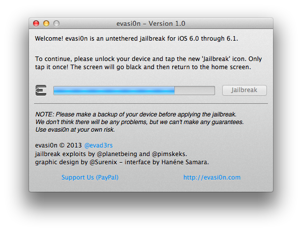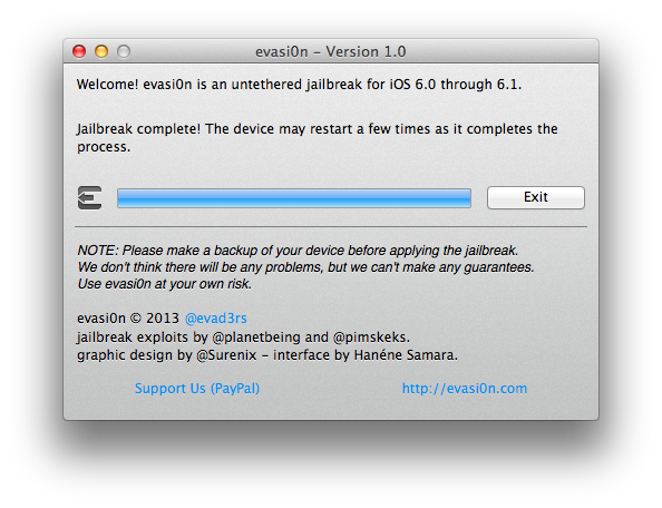 evasi0n è stato sviluppato dal team evad3rs composto da pimskeks, planetbeing, pod2g e MuscleNerd, i quali ringraziano ufficialmente: