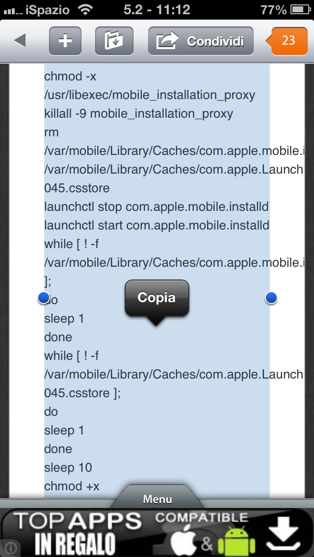 2. Una volta installato entrate in questo articolo tramite la nostra applicazione e selezionate il testo che trovate di seguito. Se dovessero verificarsi dei problemi a causa delle formattazione copiate il testo direttamente dal blog di pod2g. (Io l’ho copiato dalla push app di iSpazio e non ho avuto problemi)