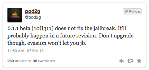 La versione iOS 6.1.1 beta rilasciata ieri da Apple non corregge le vulnerabilità che permettono il Jailbreak tramite il software evasi0n, ciò nonostante state alla larga dagli aggiornamenti.
