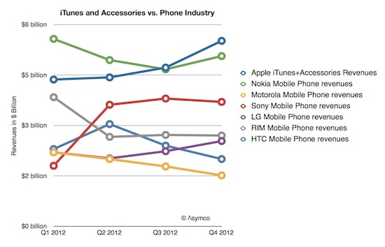 I dati sono affidabili, in quanto provengono direttamente dagli ultimi risultati fiscali rilasciati da Apple: emerge così che la vendita di accessori ed iTunes insieme hanno raccolto ben 5,5 miliardi di dollari, battendo i ricavi generati dalla vendita di telefoni di aziende del calibro di RIM, Nokia, Motorola, Sony, LG ed HTC.