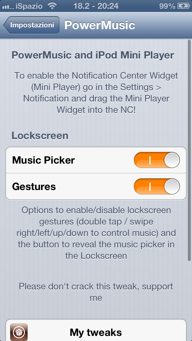 PowerMusic MiniPlayer è disponibile nella repository di BigBoss al prezzo di 1$, ovvero circa 80 centesimi di euro, è compatibile con iOS 5 ed iOS 6 ed è ottimizzato per l’iPhone 5. L’abbiamo testato con iPhone 5 iOS 6.1.1 senza riscontrare bug e lo sviluppatore ci ha segnalato che nei prossimi giorni il tweak sarà aggiornato e sarà aggiunta la possibilità di scegliere se navigare tra i brani per album o per artista o playlist.