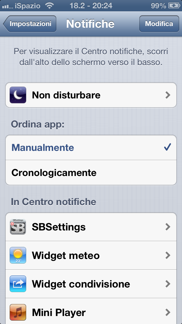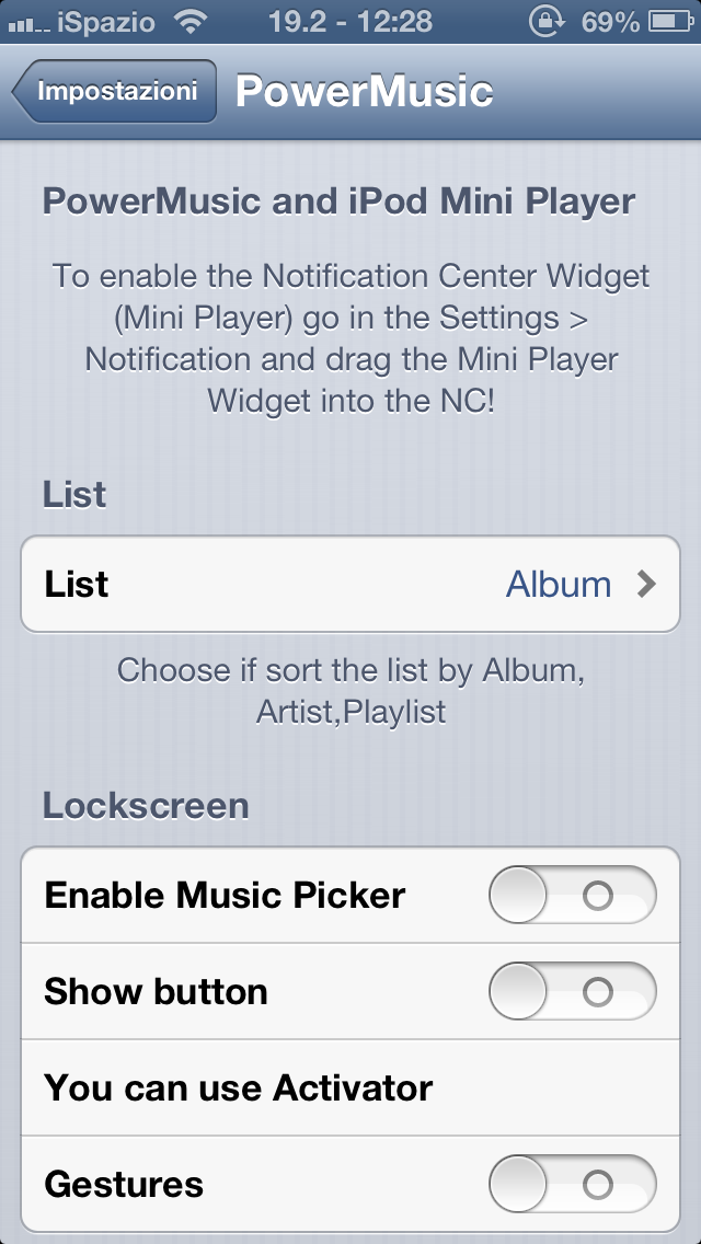 Dopo l’installazione troveremo una nuova voce nelle Impostazioni dell’iPhone “PowerMusic”, in questa schermata possiamo attivare o disattivare le funzioni introdotte nelle Lock Screen, mentre se vogliamo inserire il Mini Player nel centro notifiche dobbiamo andare in Impostazioni/Notifiche ed aggiungere la nuova voce “Mini Player” (per impostare la posizione fate un tap su “Modifica” e poi trascinate le voci a vostro piacimento)