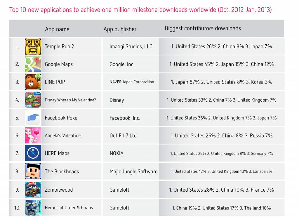 Sullo store di Cupertino infatti delle prime 250 applicazioni solamente lo 0,25% dei profitti va a nuovi sviluppatori, mentre su Android la percentuale si alza fino all’1,2%. Come possiamo vedere dal grafico le prime posizioni sono occupate da nomi conosciutissimi e spesso sono coperte da titoli ludici.