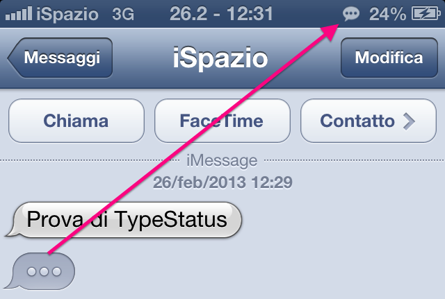 TypeStatus è un tweak semplicissimo che si può spiegare davvero in poche parole: aggiunge il fumetto che compare su iMessage quando qualcuno ci sta scrivendo, anche nella status bar vicino alla batteria. Se non l’avete mai notato, quando “messaggiamo” con qualcuno, iMessage ci mostra un fumetto con i tre puntini sospensivi se l’interlocutore sta scrivendo qualcosa. Tale fumetto quindi di norma è visibile solo nella schermata di quella specifica chat.