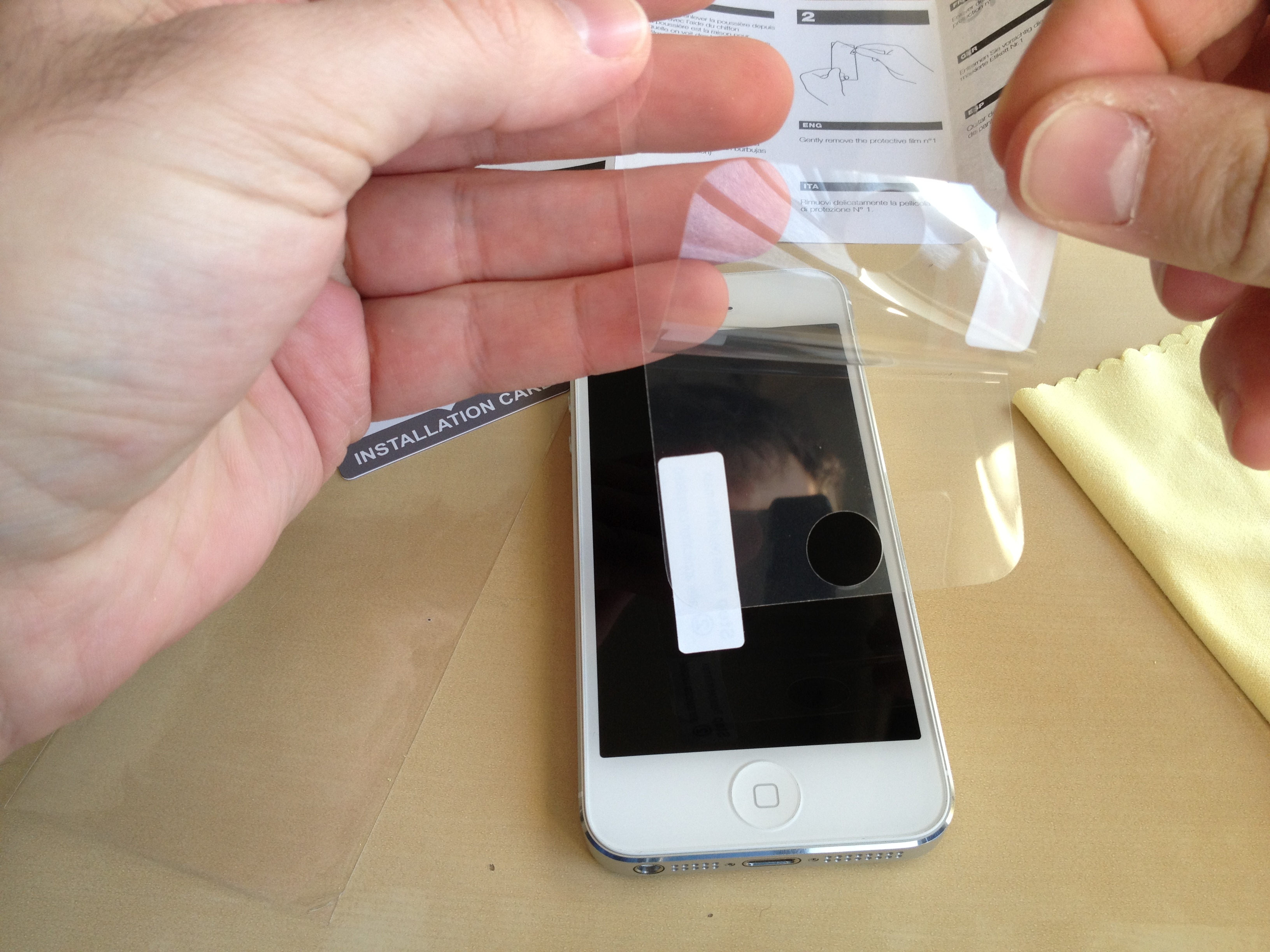 - Prima di iniziare, bisogna pulire lo schermo dell’iPhone con il panno in microfibra, facendo attenzione a non lasciare neanche un granello di polvere. È meglio perdere qualche minuto in più a togliere macchie e polvere piuttosto che ritrovarsi con una pellicola attaccata male