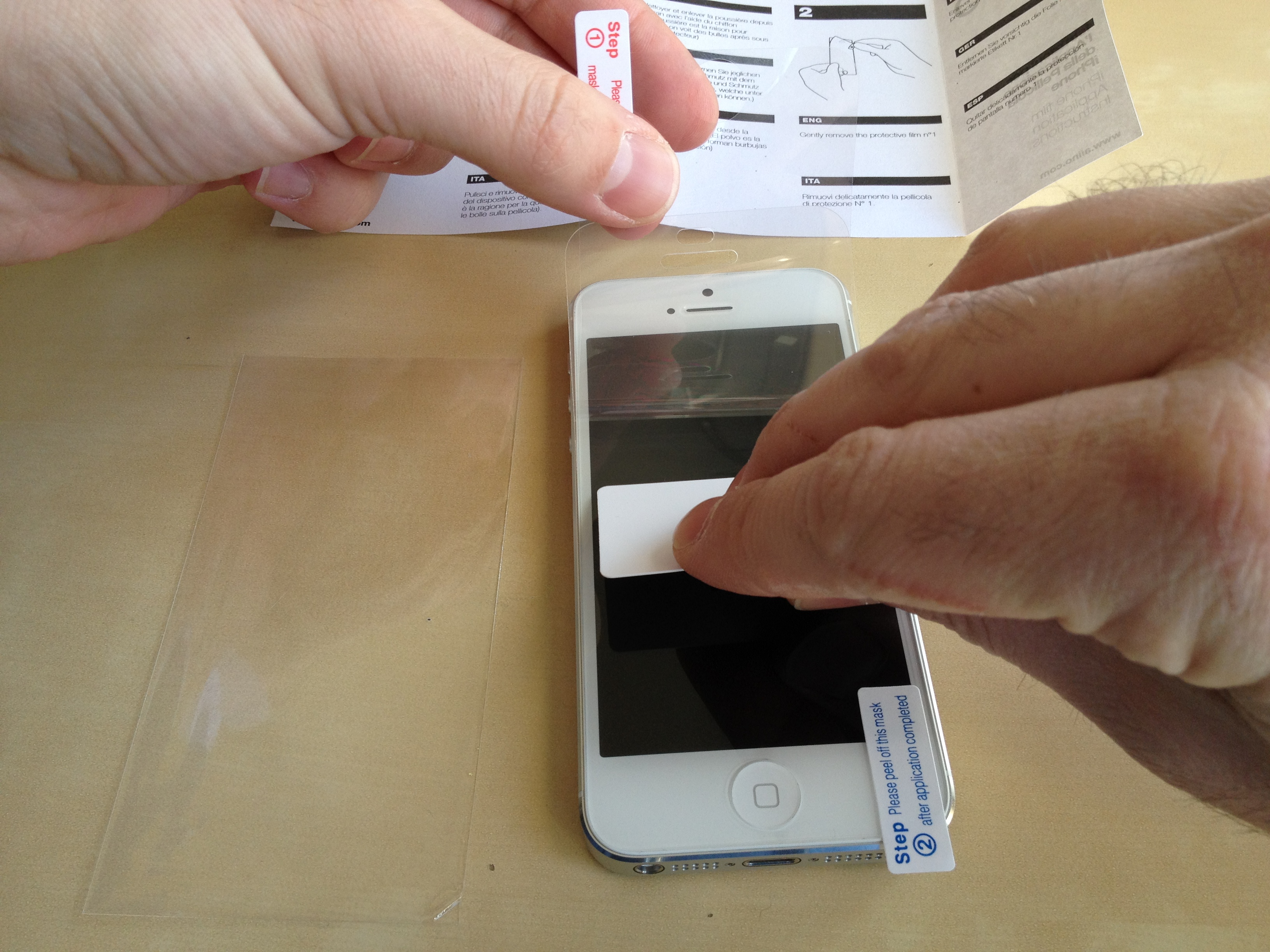 - La pellicola è protetta da due strati esterni contraddistinti da due linguette, possiamo iniziare a rimuovere lo strato con la linguetta numero 1 ed avvicinarla allo schermo