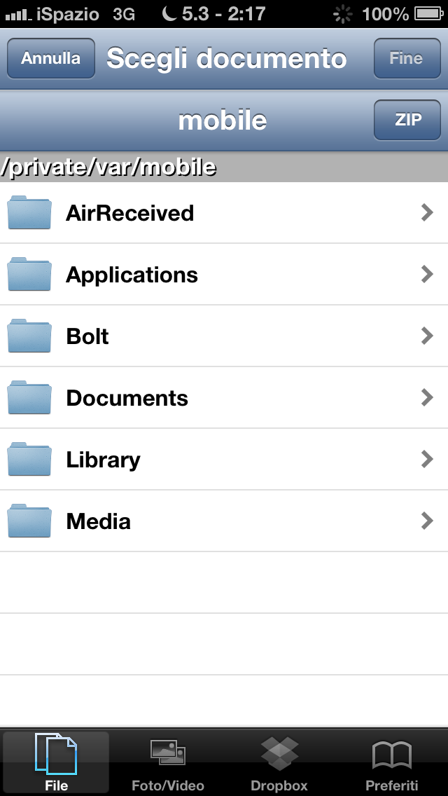 Nella cartella “File” invece potremo selezione qualsiasi file contenuto all’interno dell’iPhone, quindi anche i pdf, i documenti, gli mp3 e qualsiasi altro file presente nelle directory delle applicazioni installate sull’iPhone. Possiamo anche creare dei collegamenti preferiti, ad esempio alla cartella con i documenti di “DocsToGo”, di “Pages” e qualsiasi altra applicazione dove abbiamo i nostri file.