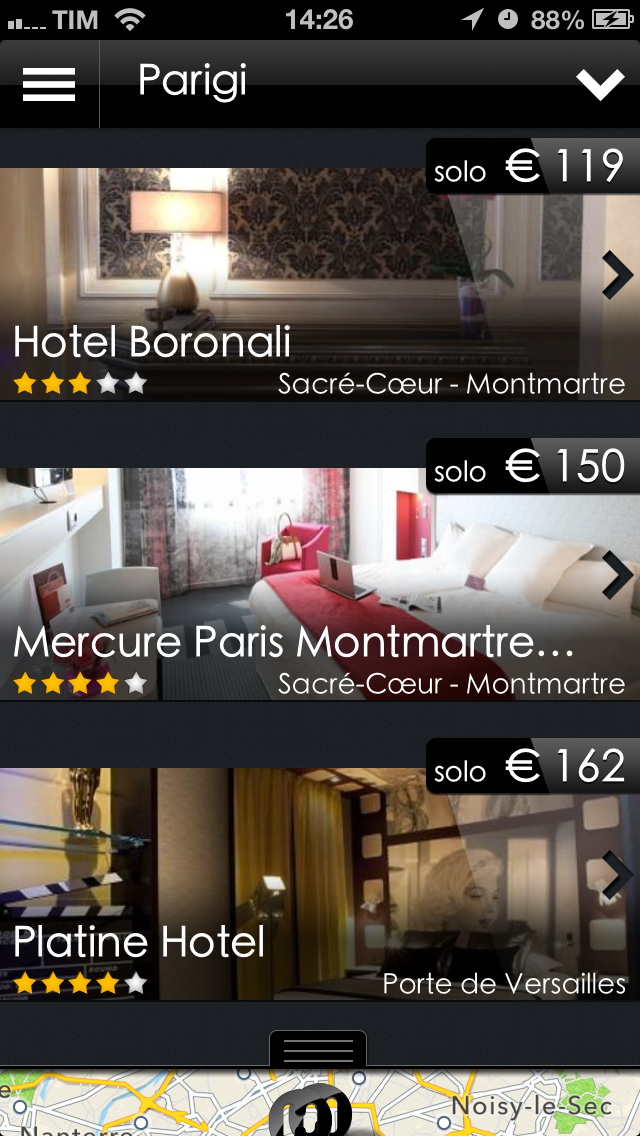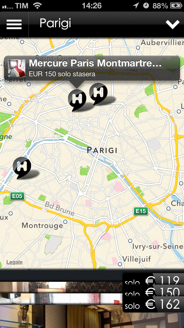 Da Elenco città possiamo selezionare la città nella quale vogliamo prenotare l’albergo per la serata stessa. Selezionata questa, come avrete già intuito, verremo indirizzati verso la scelta di tre alberghi specifici, fra i migliori disponibili secondo i criteri che abbiamo specificato poco sopra. La loro ubicazione può essere visualizzata tramite una mappa, basata sulle cartografie di Apple.