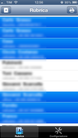Nella schermata principale abbiamo la lista di tutti i nostri contatti e possiamo scegliere se visualizzare solamente i numeri telefonici, gli indirizzi email o gli indirizzi di abitazione e sedi nel caso di aziende. Cliccando il tasto in alto a destra, raffigurante una stampante possiamo decidere se salvare i contenuti selezionati in un file PDF o procedere alla stampa su carta, tramite una stampante AirPrint.