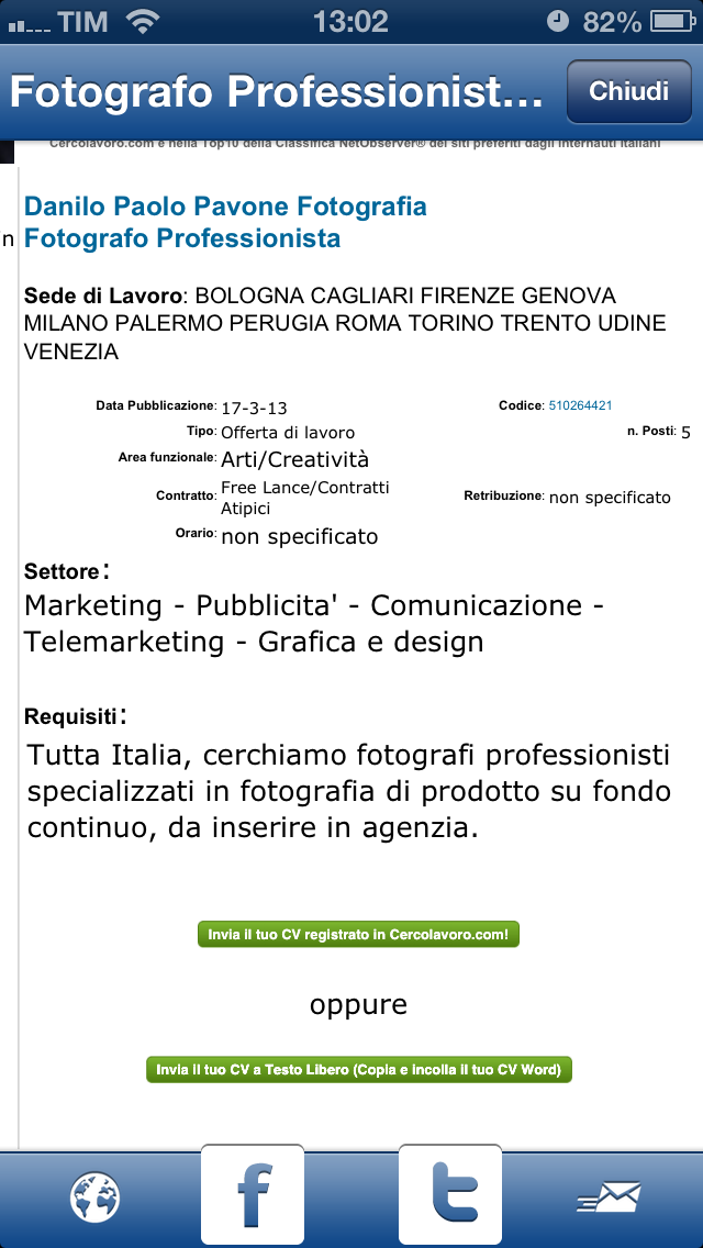 Premendo su un risultato accederemo alla pagina relativa all’offerta, con i dettagli della stessa. Potremo condividerla tramite Facebook o Twitter, così come visualizzarla via Safari Mobile e rispondere all’offerta con il nostro stesso smartphone.