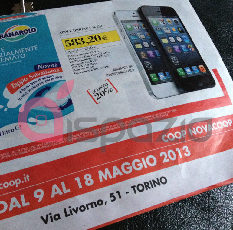 Un nostro affezionato utente ci informa che dal 9 al 18 Maggio, presso il supermercato Coop Novacoop di Torino in Via Livorno, saranno in vendita iPhone 5, nella versione da 16 Gb, al prezzo di 583,20 euro anziché 729 euro. Ecco di seguito il volantino inviato da Davide, che ringraziamo. Si tratta di un gradito 20% di sconto rispetto al prezzo ufficiale; promozioni come queste sono davvero rare per i prodotti Apple.