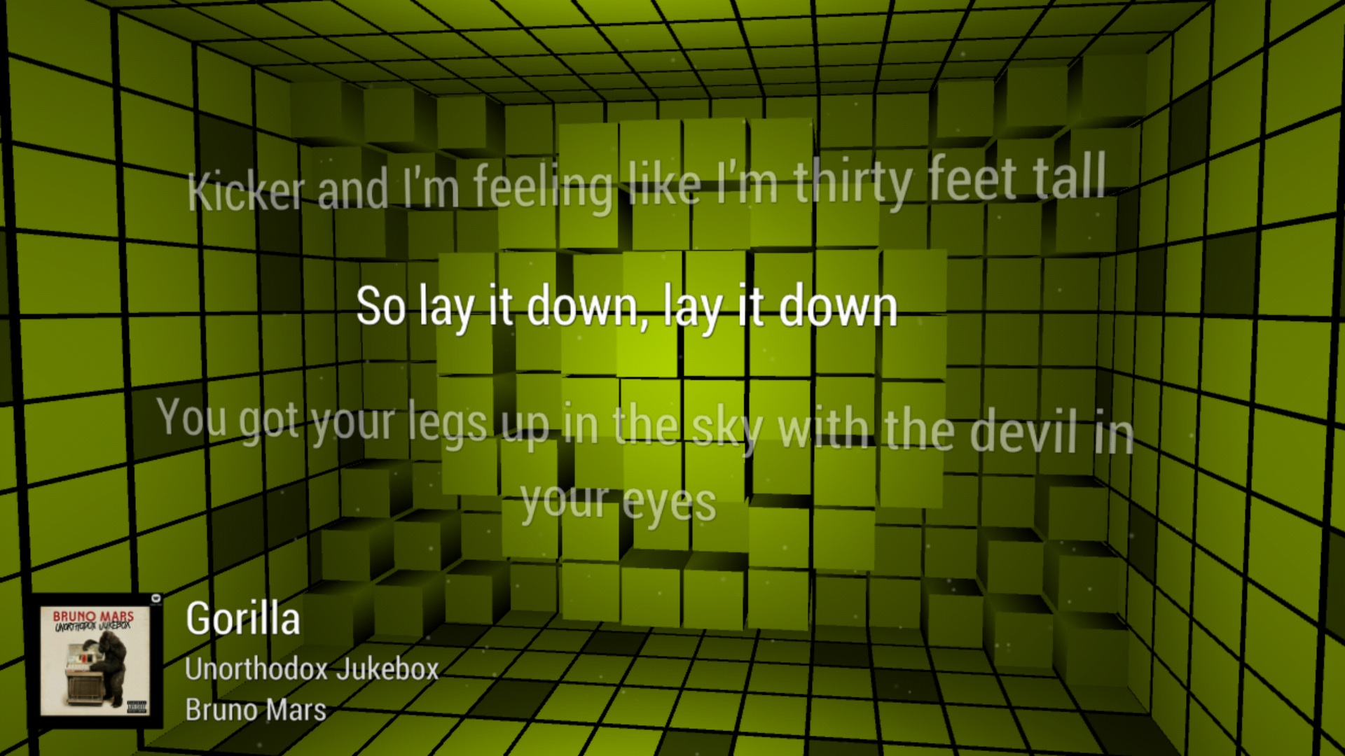 Anche il Player musicale è ben fatto e ben strutturato, ci permette di avere diversi tipi di visualizzazione, in base al nome del brano, il nome dell’album o il nome dell’artista. La caratteristica più carina, a mio avviso, riguarda l’integrazione di GraceNote un servizio che permette di ricercare il brano online ottenendo il testo in tempo reale che scorre sullo schermo esattamente nel momento in cui il cantante lo pronuncia. Tutto questo viene accompagnato da un bell’effetto video, generato automaticamente a ritmo di musica, e da transizioni in cui figurano la copertina dell’album ed il titolo del brano quasi come se stessimo guardando un canale TV dedicato alla musica.