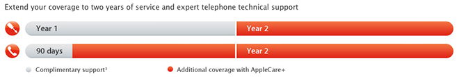 Anche la copertura gratuita dopo l’acquisto dei prodotti subirà un aggiornamento, introducendo un nuovo sistema in cui il supporto telefonico persisterà per almeno un intero anno, con eventuale supporto di due anni. L’utente attualmente dispone di 90 giorni di supporto telefonico gratuito senza comprare il piano AppleCare aggiuntivo. Il supporto on-line, le chat dal vivo e le visite al Genius Bar continueranno ad essere servizi gratutiti.
