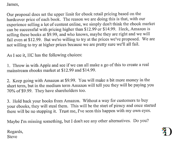 “Non crediamo che il mercato degli e-book possa avere successo con prezzi superiori ai 12.99 e 14.99$”, si legge all’interno dell’e-mail. “Amazon vende a 9,99$ e probabilmente hanno ragione e noi torto e falliremo i nostri obiettivi anche a prezzi più elevati. Ma vale la pena provare ai prezzi che indichiamo, ma non a soglie più elevate, altrimenti siamo sicuri di mancare i nostri obiettivi.”
