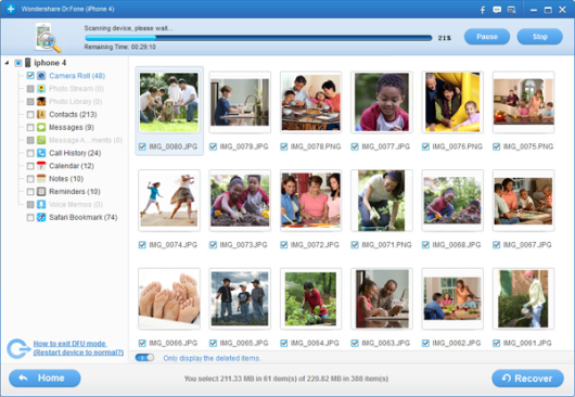 Per chi possiede un iPhone 5 o iPhone 4s, il funzionamento di Dr.Fone è molto semplice: basta collegare il dispositivo al computer tramite cavo USB, avviare Dr.Fone e lanciare la scansione. Per chi possiede invece un iPhone 3GS e iPhone 4, per avviare la scansione è indispensabile mettere il dispositivo in modalità DFU. Il programma comunque indica graficamente i passi da seguire per accedere correttamente alla modalità DFU: