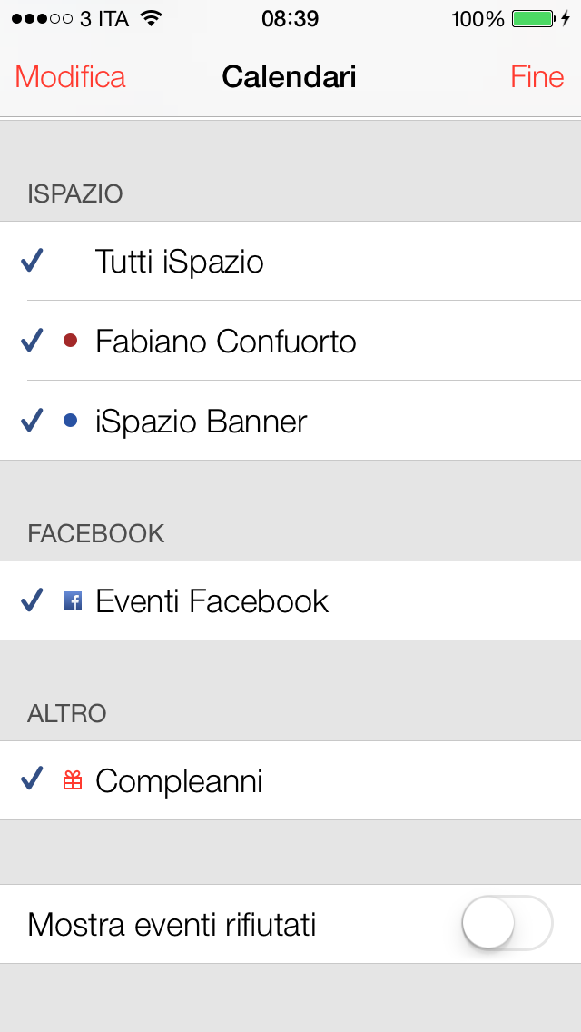 E se non bastasse, clicccando sul pulsante centrale “Calendario” potremo scegliere di attivare o disattivare alcuni Calendari, nascondendo quindi la visualizzazione di alcuni eventi, come ad esempio quelli di Lavoro in un momento in cui cerchiamo tutt’altro. Il Calendario di iOS 7 risulta quindi molto semplice da utilizzare e molto funzionale.