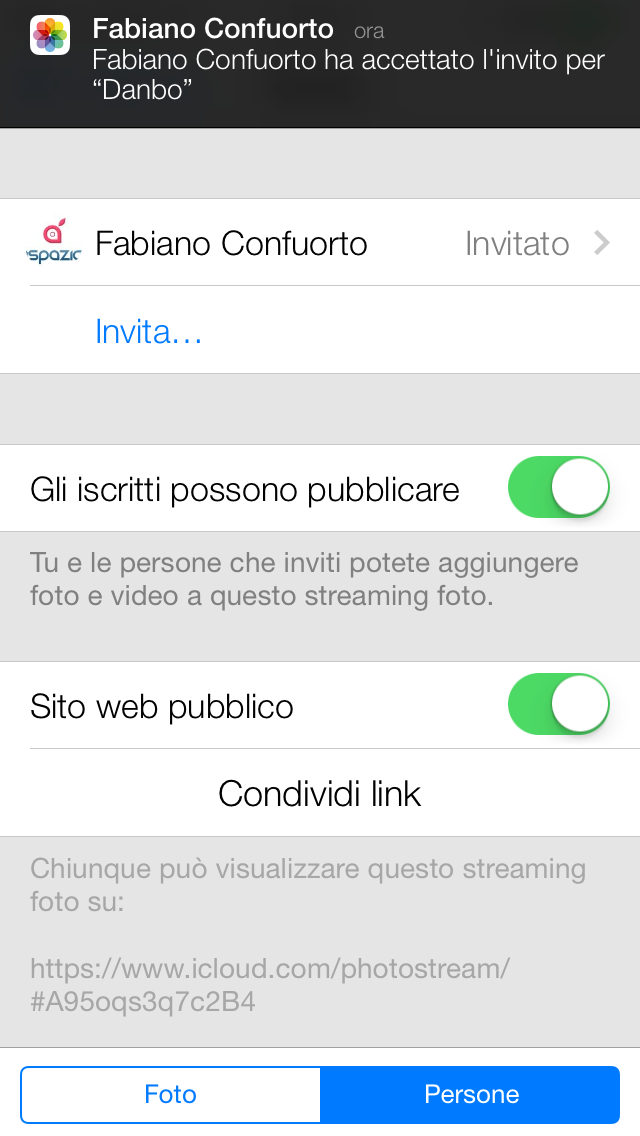 L’integrazione di iCloud ci permette, oltre che creare uno streaming di foto da zero, di condividere un intero “Momento” con gli amici, i familiari o in maniera pubblica. Basterà un tap sul tasto Condividi posto sulla destra di ogni Momento e potremo scegliere soltanto alcune foto o l’intero evento per permettere a qualcun altro di vederlo sfruttando il servizio di hosting e storage offerto da iCloud. Per ogni evento potremo scegliere un nome, aggiungere una descrizione e l’elenco di persone abilitate a vederlo. Bastano veramente pochi tocchi ed il gioco è fatto.