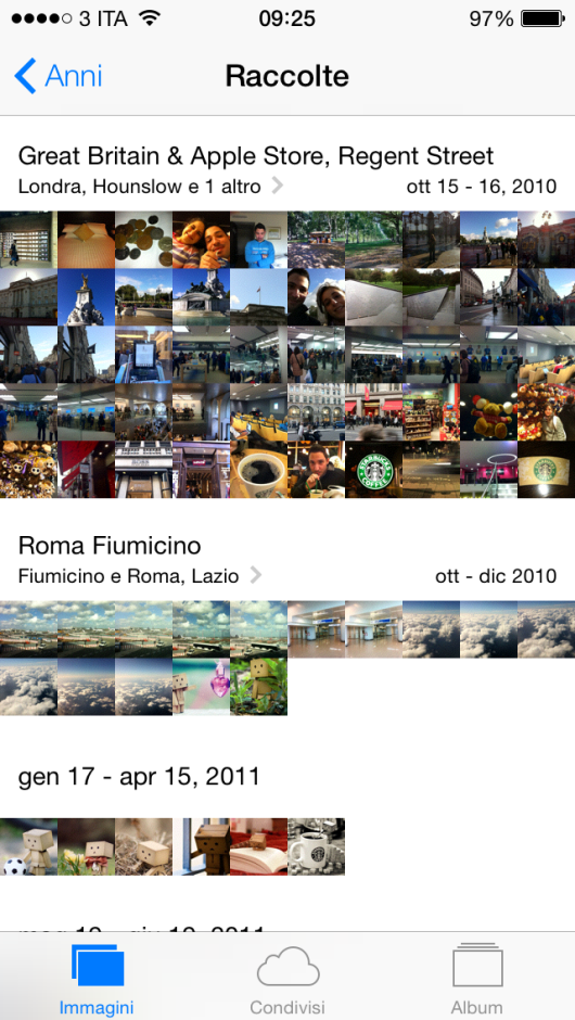 Infine dalle Raccolte si passa agli Anni, dove visualizzeremo miniature minuscole di tutte le nostre foto scattate nei vari anni. Con questo sistema Apple intende offrire i mezzi per archiviare tutta la propria vita riuscendo però a ritrovare una foto che si desidera con estrema semplicità. Con un esempio pratico, nella visuale ad “Anni” raccoglieremo tantissime esperienze, con le Raccolte riusciremo a trovare la nostra vacanza estiva e con i Momenti arriveremo velocemente a quella foto in spiaggia con gli amici, che tanto volevamo rivedere.
