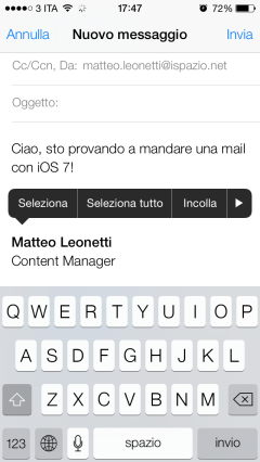 La scrittura di un nuovo messaggio resta perlopiù invariata. Quando si sceglie l’indirizzo dal quale inviare il messaggio si assiste ad un divertente effetto carosello. L’inserimento delle foto all’interno del messaggio avviene come nella precedente versione dell’applicazione, tenendo premuto e selezionando “Inserisci foto o video” dal pop up che vi compare.