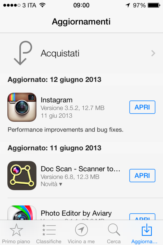 Su iOS 7 infatti è finalmente possibile attivare dalle Impostazioni un’opzione che ci permette di avere le nostre applicazioni sempre aggiornate automaticamente. Per mettere a conoscenza l’utente dell’avvenuto aggiornamento, questo verrà notificato all’interno della schermata Aggiorna, assieme alla data dell’avvenuta operazione.