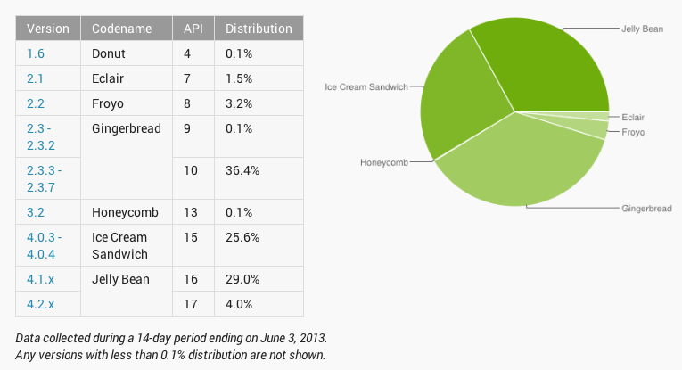 Inoltre, le statistiche di Google riguardano solo i dispositivi che accedono regolarmente a Google Play, esclusi i prodotti basati su Android come il Kindle File di Amazon, i milioni di dispositivi Android in Cina e tutti i dispositivi che non usano i servizi di Google. Oltre il 50% dei dispositivi Android utilizzano un sistema operativo vecchio di 2 anni.