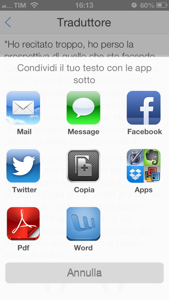 Il testo scansionato può essere modificato a nostra discrezione e condiviso con tantissime applicazioni, fra cui: Mail, Messaggi, Facebook, Twitter, Word, o altre applicazioni che abbiamo installato nel nostro dispositivo che l’applicazione riconoscerà automaticamente.