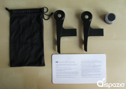 All’interno della confezione troviamo un paio di ‘sorprese’ interessanti, ovvero oltre alla lente ed al supporto per iPhone 5, troviamo anche un sopporto per iPhone 4/4S e un sacchetto per trasportare la lente senza rovinarla. Troviamo inoltre un cartoncino che ci spiega brevemente i primi passi per entrare nel mondo di Dot (anche in italiano).