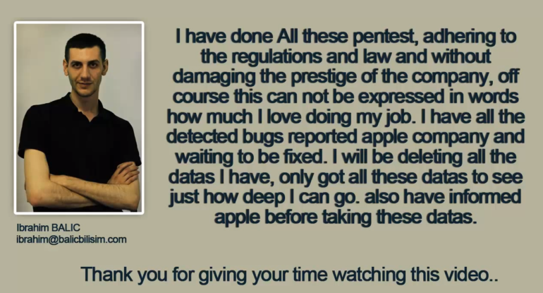 Balic ha anche pubblicato un video su YouTube in cui mostra alcuni dei dati che è stato in grado di rubare mostrando i nomi e gli indirizzi email di alcuni sviluppatori. L’uomo ha anche spiegato che i dati personali comunicati non riguardano solo gli sviluppatori, ma anche gli utenti non registrati al sito dev. Il video si conclude con una dichiarazione scritta da Balic ribadendo che ha condiviso i bug che ha trovato con Apple e che cancellerà tutti i dati utente che ha rubato.