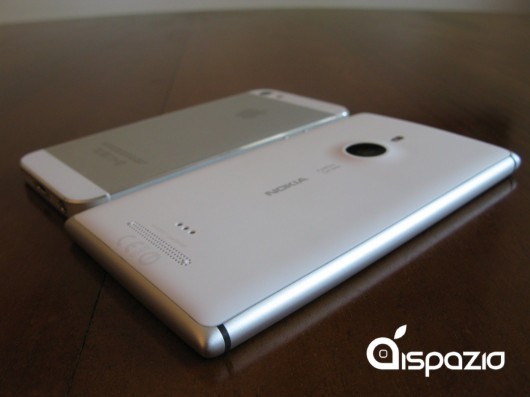 Per quanto riguarda lo spessore è davvero difficile apprezzarne la differenza, 8,5 millimetri per il Lumia 925 e 7,6 millimetri per l’iPhone 5. Anche da un confronto diretto è difficile capire che il Lumia è più spesso, complice anche il design con le sue curve lungo i bordi e probabilmente anche la scelta di far sporgere solo la fotocamera e non aumentare lo spessore di tutto il device.
