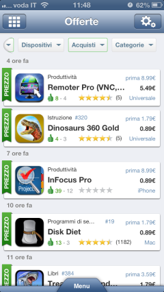 E’ sicuramente la sezione più interessante che vi permette di visualizzare tutte le offerte in AppStore. Ogni volta che un’applicazione qualunque diminuisce il suo prezzo iniziale, la vedrete apparire qui. Potremo abilitare il sistema di filtraggio per visualizzare soltanto le applicazioni iPhone, iPad o Mac. Sulla parte sinistra vediamo l’icona mentre a destra il prezzo precedente e quello attuale. Se non modificate nulla, la sezione mostrerà sia le app che scendono di prezzo (esempio: da 2,69€ a 0,89€) sia quelle che diventano gratuite. Un mio consiglio è quello di attivare il filtro per visualizzare soltanto le app che scendono di prezzo, in quanto esiste una sezione apposita che vi descriverò tra poco che mostra soltanto le app che diventano gratuite. In questo modo quindi potremo “smistare” in due sezioni le app che scendono di prezzo e quelle che sono momentaneamente gratis.