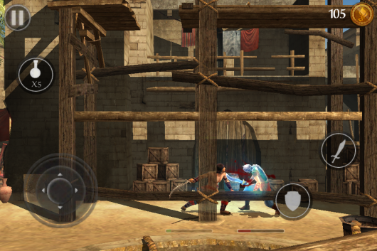 Come potete vedere, in basso a sinistra avremo il nostro pad virtuale per muovere il personaggio, mentre sul lato destro sono presenti i tasti relativi alle azioni che il principe andrà ad eseguire: camminata furtiva, salto, capriola. In alto a sinistra, sopra il pad, avrete a disposizione le pozioni magiche ed il relativo numero residuo. Come vedete la grafica è davvero ottima per un platform, ed anche gli scontri con i nemici sono davvero entusiasmanti.