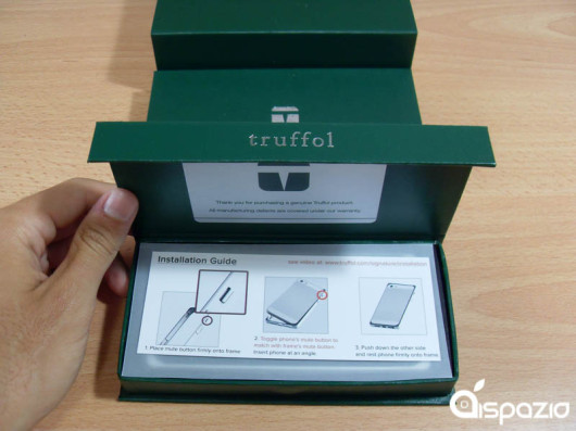 La scatola in cartone verde rigido telato fa già la sua bella figura. Composta da due vassoi che scorrono lateralmente, l’eleganza non sta solo nella cover ma anche in tutto l’imballo. Ogni vassoio conterrà una striscia in carta con le istruzioni per montare la parte inclusa. Oltre alle istruzioni, all’interno delle confezioni troveremo anche una pellicola per il display dell’iPhone con panno per la pulizia annesso, il bumper in metallo, il tasto mute ed il retro in pelle.