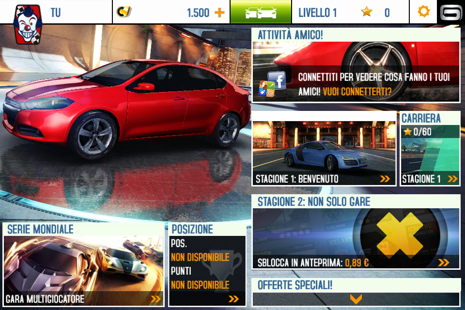 La sezione “Attività amico” vi consente di collegare il gioco con il Game Center o Facebook per vedere i progressi dei vostri amici e sfidarli. Le “Stagioni” sono i livelli che contengono le gare che andrete a vincere in modalità “Carriera” o anch’esse sbloccabili tramite acquisti in-app. Se volete divertirvi subito e senza aspettare, potrete farlo con “Gara Veloce” dove vi basterà scegliere tipologia di evento, tracciato e classe automobilistica per iniziare la corsa.