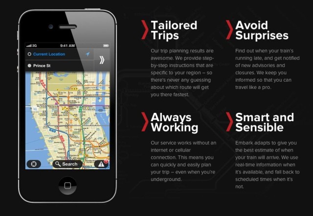 Da quando è stata rilasciata nel 2011, Embark per iOS e Android ha fornito informazioni dettagliate sui sistemi di trasporto pubblico per città specifiche come New York, San Francisco e Los Angeles. Tali app sono tuttora disponibili in App Store, mentre Apple semra aver già bloccato la loro disponibilità nel Google Play Store.