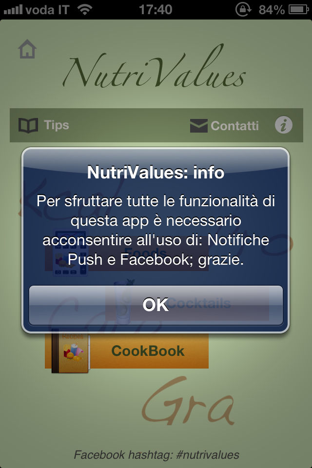 Avviando l’applicazione verrete subito informati, tramite pop-up, che per sfruttare appieno le funzionalità dell’applicazione è necessario (anche se non prettamente obbligatorio) acconsentire all’uso di notifiche push e Facebook (collegando l’app al vostro account).