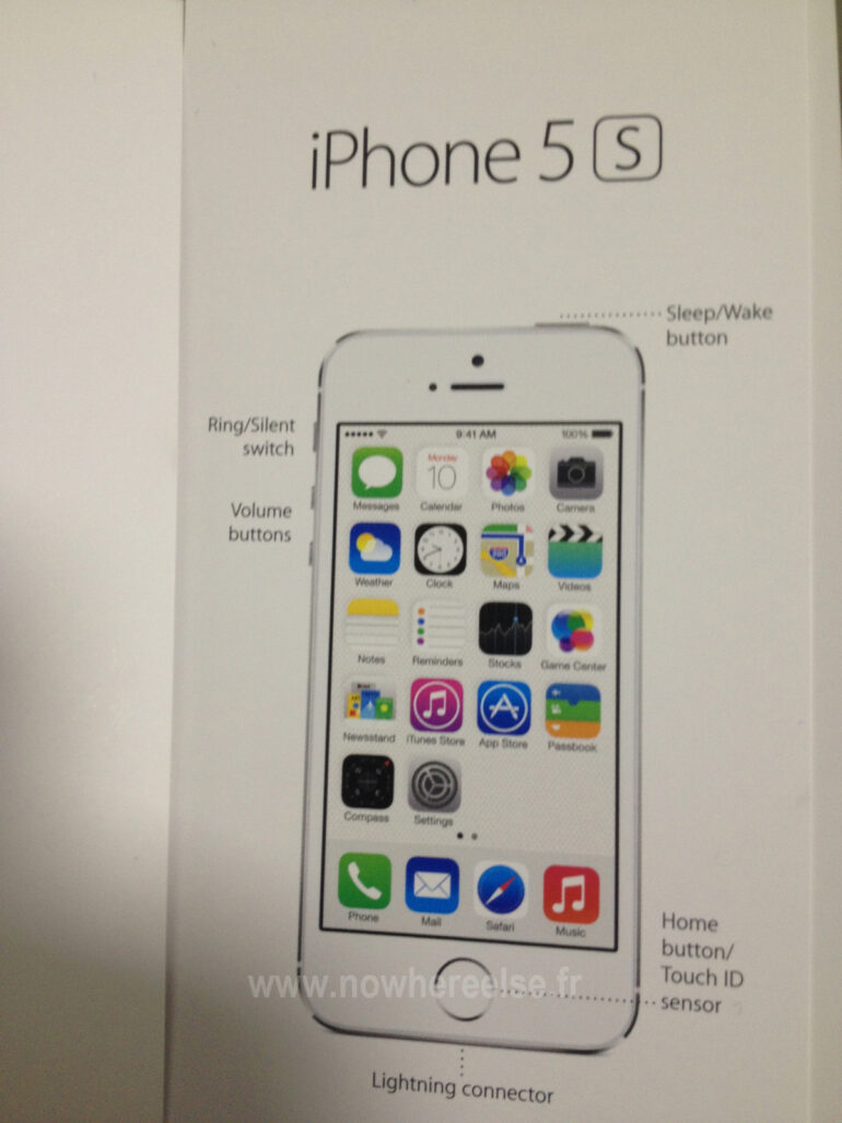 Come con “Lightning” per dare un nome al nuovo cavo per i dispositivi iOS, il lettore di impronte digitali si chiamerà Touch ID. Di seguito vi mostriamo l’immagine del manuale che sarà presente nella confezione del tanto blasonato iPhone 5S, direttamente segnalata da Nowherelse: