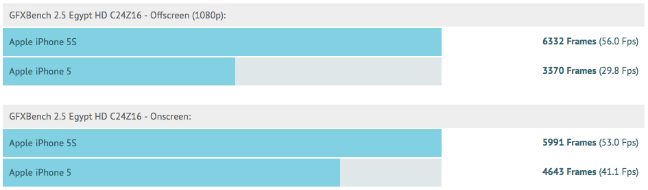 L’iPhone è infatti migliorato passando dai 41.1fps di iPhone 5 ai 53.0fps di iPhone 5S nel test onscreen. Per quanto riguarda invece il test offscreen, il risultato di iPhone 5 è di 29.8fps, mentre quello di iPhone 5S è di 56.0fps.