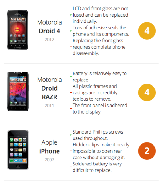 A seguire una serie di smartphone con una difficoltà di riparabilità abbasatanza alta, tra cui Motorola Droid 4, Droid RAZR ed il primo iPhone.