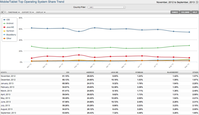 Nel frattempo, il principale rivale di iOS, Android, ha visto la sua quota di mercato mobile globale cresce dal 28,12% di agosto al 29,43% del mese scorso. BlackBerry continua la sua inesorabile caduta, passando dal 3,28% al 3,26% durante lo stesso periodo, e Symbian in qualche modo ha incrementato la sua quota fino al 4,48% nel mese di settembre.