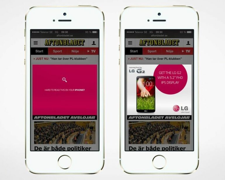 Ciò significa che se l’utente sta navigando sul web tramite iPhone, comparirà un popup chiedendo “è difficile leggere questo sul tuo iPhone?”. Premendo poi sul banner sarà visibile l’annuncio pubblicitario vero e proprio, il quale decanterà le doti del display del nuovo LG G2 (5,2 pollici, Full HD, display IPS).