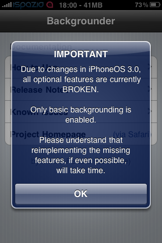 L’applicazione torna quindi alla sua versione base, ma se sarà possibile, con un po’ di tempo, lo sviluppatore ri-aggiungerà tutte le opzioni anche sul 3.0. Potremo quindi utilizzare il background cliccando a lungo sul tasto Home fino a quando non visualizzeremo un pop-up che ci notificherà del backgrounder attivato su quella determinata applicazione. A questo punto potremo uscire senza comprometterne il funzionamento, dato che contierà a girare anche mentre utilizzeremo l’iPhone per fare altro.