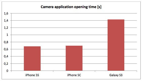 La società ha misurato anche il tempo di apertura dell’applicazione Fotocamera e il tempo di caricamento di una pagina web in Wi-Fi sempre tra iPhone 5S, 5C e Galaxy S3. Come ci saremmo aspettati, entrambi i tempi sono molto maggiori nel Galaxy S3 rispetto ai due iPhone. Di seguito i grafici: