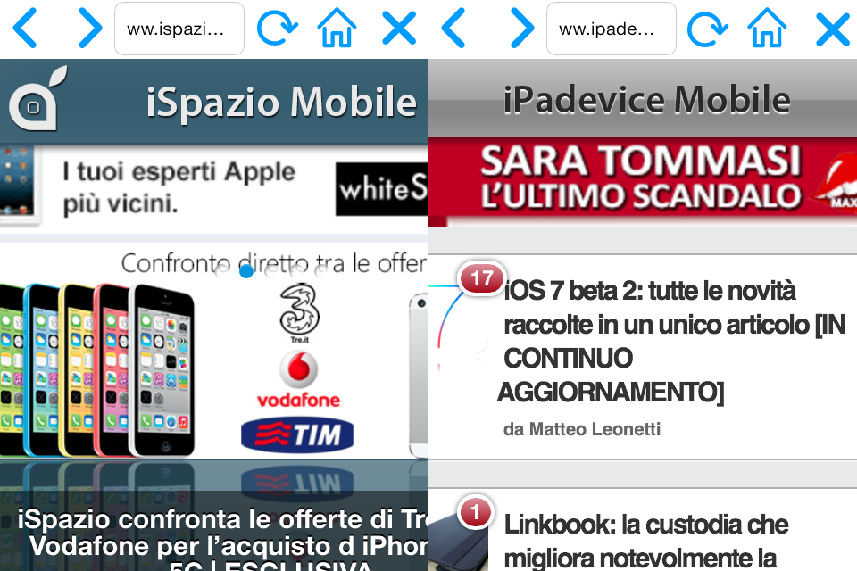 La grafica è molto semplice ed in stile iOS 7, troveremo lo schermo del nostro dispositivo diviso in 2 ed entrambe le schermate si presenteranno identiche, con una barra sul lato alto del dispositivo all’interno della quale sono posizionati alcuni utili pulsanti che serviranno per tornare alla pagina precedente o successiva, ricaricare la pagina, andare alla homepage o interrompere il caricamento. Ovviamente non manca lo spazio riservato all’inserimento degli indirizzi web.