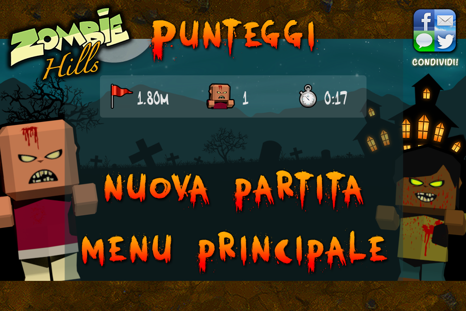 Avviando il gioco assisterete ad un breve filmato introduttivo, dopodichè vi comparirà la schermata di gioco principale dove potete trovare in basso a sinistra il collegamento con le classifiche del GameCenter, ed in basso a destra la possibilità di condividere informazioni su Facebook, Twitter, SMS o mail. Al centro della schermata trovate la scritta lampeggiante “Gioca!” per iniziare da subito la vostra avventura nel mondo degli zombie.