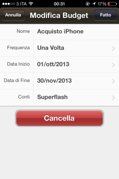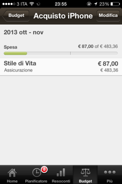 La quarta sezione dell’applicazione riguarda invece i Budget: qui potremo pianificare varie periodicità di budget, inclusi i budget validi una sola volta o quelli ricorrenti per poi visualizzare i progressi attraverso la barra di avanzamento per ogni categoria.