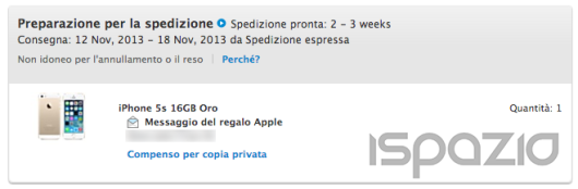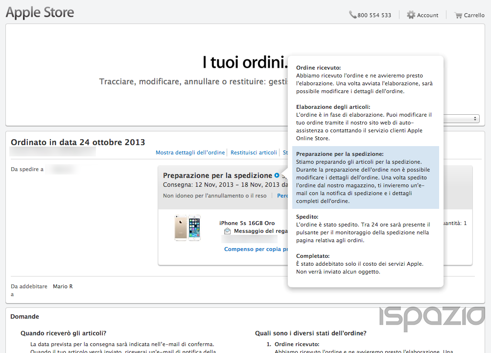 Come ci faceva notare un nostro fan di Facebook Alessio C., se abbiamo ordinato l’iPhone 5S la notte del Day One entrando nei dettagli dell’ordine noteremo che l’iPhone è pronto per essere spedito, quindi mancano pochi giorni alla consegna.