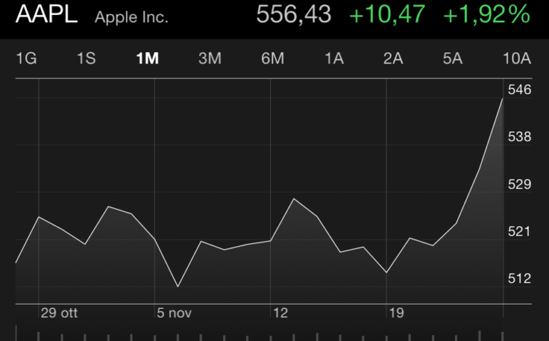 Il 2013 non è stato un anno per niente stabile in Borsa per Apple, ma fortunatamente le azioni hanno ripreso lentamente valore, anche grazie al fatto che sono stati presentati nuovi prodotti delle linee iPhone, iPad e Mac. Nella giornata di oggi però l’aumento è stato importante, poichè il Black Friday ha portato i titoli AAPL oltre quota 556 dollari per azione.