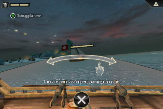 Per colpire la nave nemica con i cannoni, basterà cliccare il pulsante corrispondente, e comparirà sullo schermo la traiettoria del colpo. Per modificare quest’ultima, sarà sufficiente tenere premuto il dito sullo schermo, e muoverlo nella direzione opportuna. Non appena avrete aggiustato la mira, rilasciate il dito e la nave sparerà automaticamente. Naturalmente dopo aver sparato, i cannoni avranno bisogno di qualche secondo per essere ricaricati.