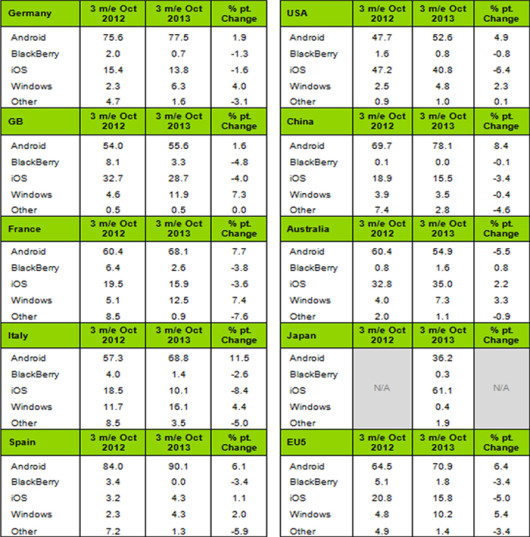 La nota società di ricerche Kantar Worldpanel ha rilasciato un nuovo rapporto, il quale evidenzia le vendite globali degli smartphone nel periodo agosto-ottobre. La quota di mercato di Apple nella maggior parte dei Paesi è inferiore rispetto ad un anno fa, ovvero in corrispondenza con il lancio dell’iPhone 5.