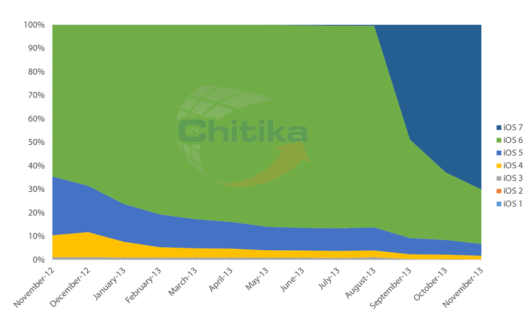Come si vede dal grafico le versioni obsolete di Android Gingerbread, Ice Cream Sandwitch e Jellybean sono ancora molto utilizzate. Si seguito invece i dati riguardanti la diffusione di iOS, sempre aggiornati allo scorso mese di Novembre. iOS 7 e iOS 6 sono installati in quasi la totalità dei dispositivi iOS.